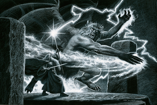 This is the finished private black board commission Greg worked on. Greg creates an epic composition of good vs evil! Lighting and fire dance across the page as the Balrog goes to strike Gandalf. Gandalf rises his staff and his sword in hand ready to defend and fight.